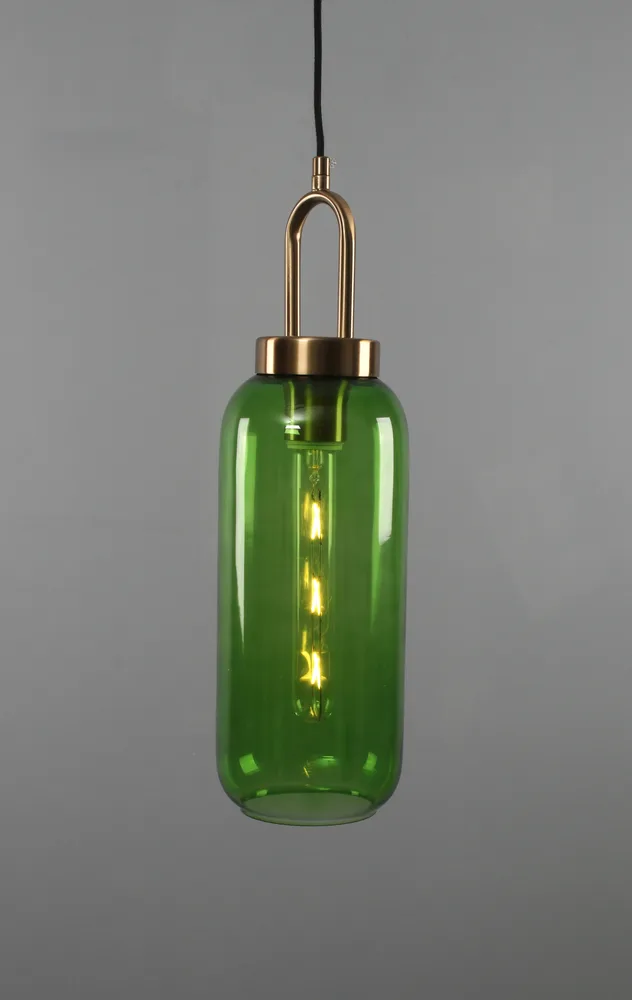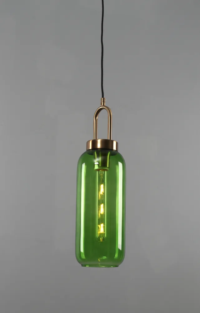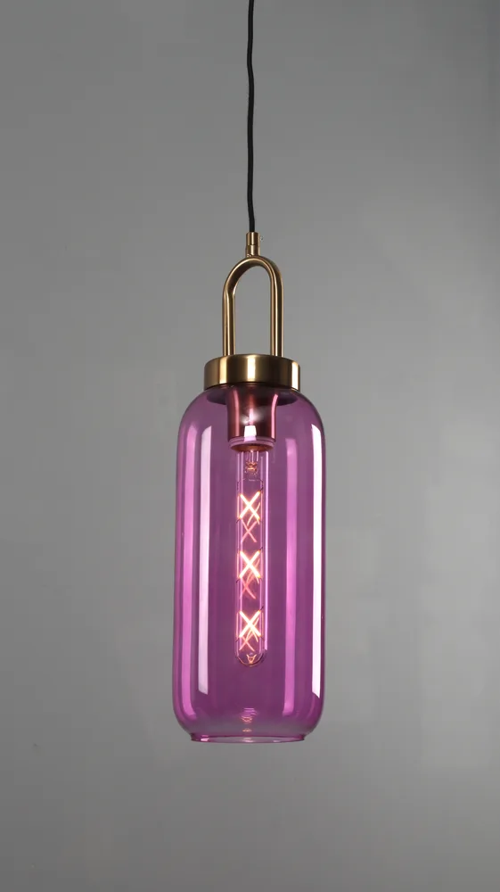 ANIS תלייה דגמים- 2773 ו-2763 מציעים גוף תאורה המורכב מטבעת אלומיניום מוזהבת, בית נורת E27 וזכוכית ירוקה או סגולה.