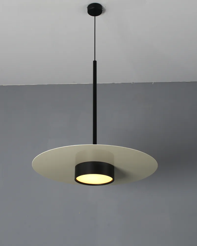 בתמונה ראונדו המורכב מצלחת 50 ס"מ קוטר צבע RAL1013 משולבת צילינדר דק במיוחד בצבע שחור ובהספק גדול של 24W, יחד שניהם נתלים ממוט של 50 ס"מ אורך.